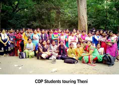 As journalism is incorporated in the course syllabus, the cop students were taken to different places, wherein the students could get an opportunity to gain practical knowledge. An educational tour was arranged for the students of COP. This tour covers Theni and the important area around it. The students visited the next nearby village, Veerapandi. The COP students visited Chinnalampatti Arun textiles. There students practically saw the spinning machine which is used for manufacturing 100% cotton materials.