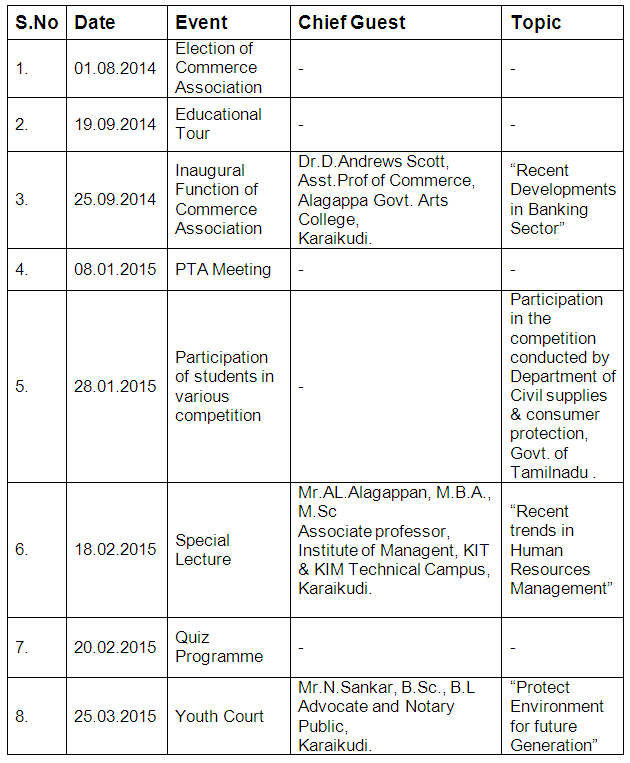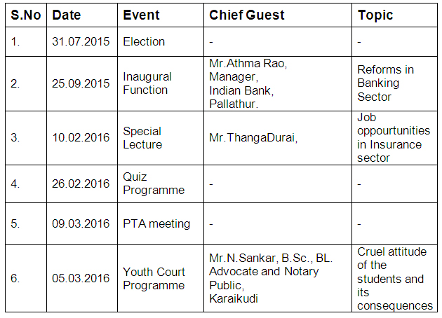 | 6. | 15.08.2015 | Nachiappa Swamigal Arts & Science College, Koviloor. | Inter-Collegiate seminar on “Career Awareness Towards Success”. | 8 students of II B.in participated. |