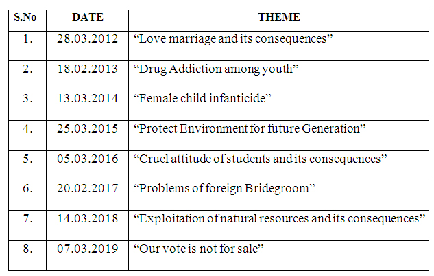 The first and foremost aim is that the students have to know what is happening in our day-to-day social life. Youth court is nothing but a reflection of events in the society. The students will know their legal right and social responsibility and also educate the others. Ever since 2003 Youth Court has been conducted focusing the women’s right, dowry harassment, marital dispute, bribe etc in the society in order to know how to overcome them. Once a student acted as judge in the Youth Court which had become the turning point in her life to persue legal studies. This is one of the inputs of the youth court.