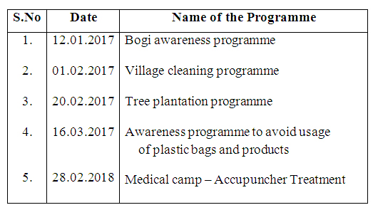 Tree plantation, Village cleaning programme, Rally for Bogi awareness, Non usage of plastic products were conducted by our students.