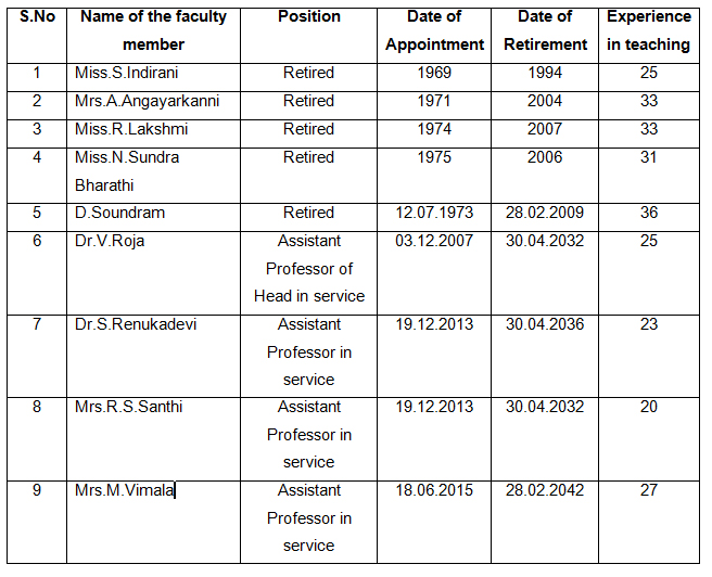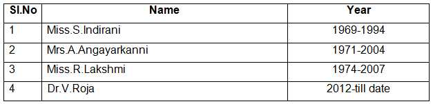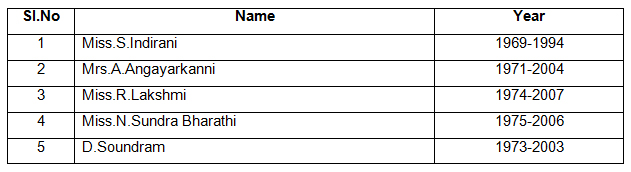 Mrs.A. Angayarkanni served as the H.O.D from August 1994 to August 2004, till her retirement(V.R.S), Miss.R.Lakshmi was designated as H.O.D on 14th August 2004.