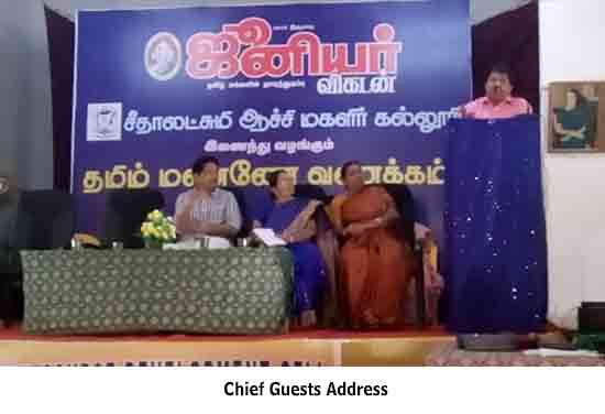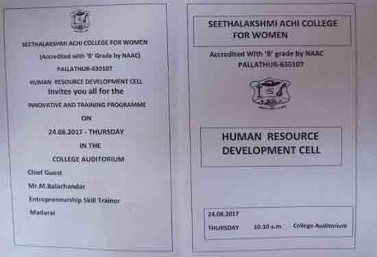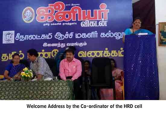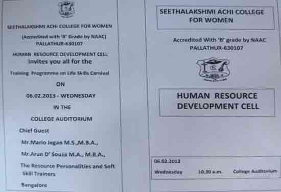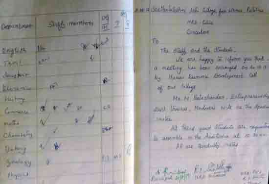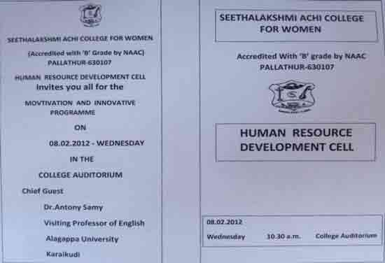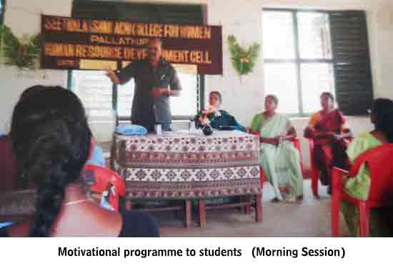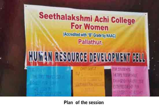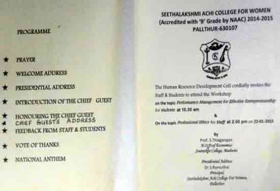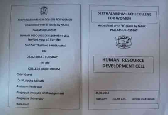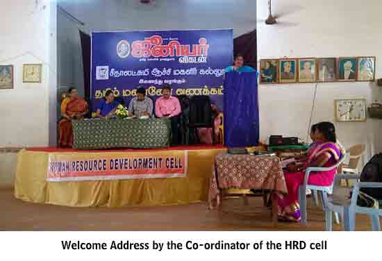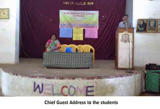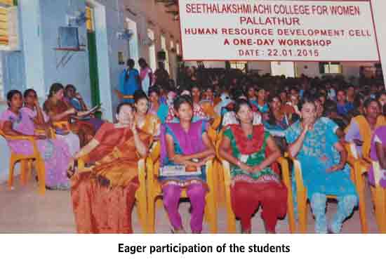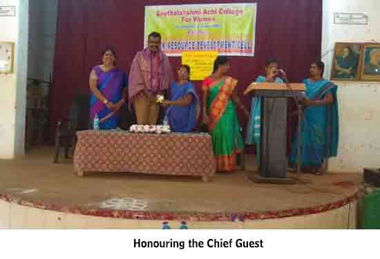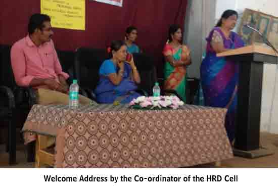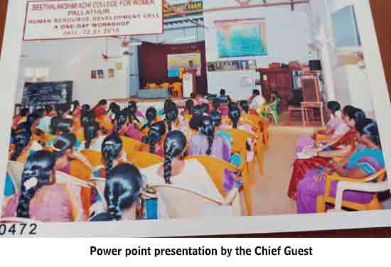 Under the auspices of the HRD Cell of our College organized a programme on 22.01.2015. Dr. S. Thiagarajan, H.O.D. of Economics, Sourashtra College, Madurai, inaugurated the activities of the HRD Cell. On the same day the Chief Guest Dr. S. Thiagarajan conducted a One-Day Workshop for students on the topic “Performance Management for Effective Entrepreneurship” between 10.30 am. and 1.00 pm. He gave many useful tips as how to develop leadership qualities, to set goal, talked about courage, self-confidence and time management through powerpoint presentation with interesting anecdotes. The Chief Guest Dr. S. Thiagarajan inspired the students with the most significant topics like ‘Personal Development’, ‘improving Self-Awareness’, ‘Developing Talents’, ‘Health’ etc. He gave training on how to be different and how to act and think differently. He also conducted job-oriented Work-shop like ”Group- discussion” , Building the Resume, and on ‘Etiquete’. The impact on the students was more as they were able to visualize the workshop on a large screen.