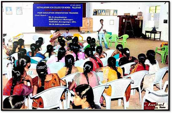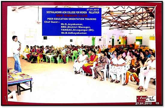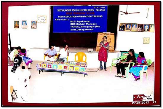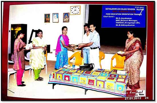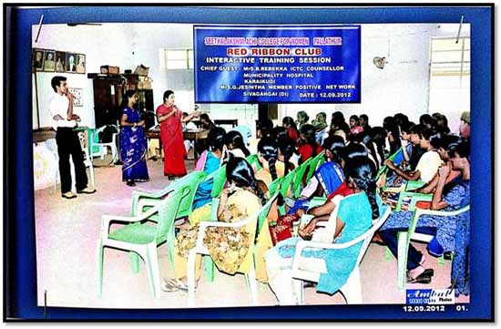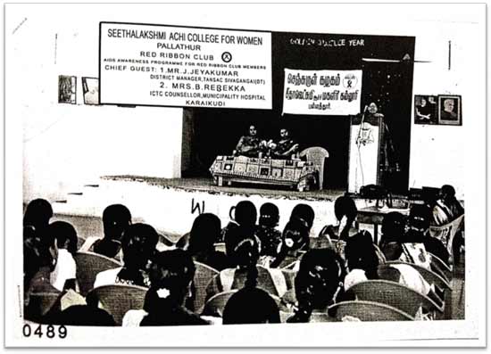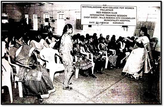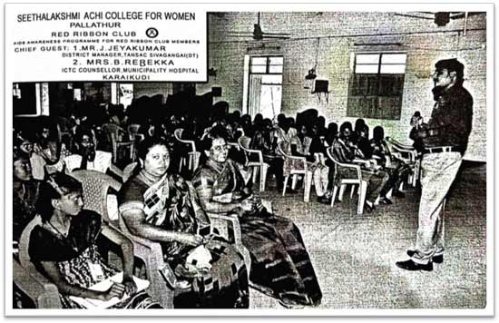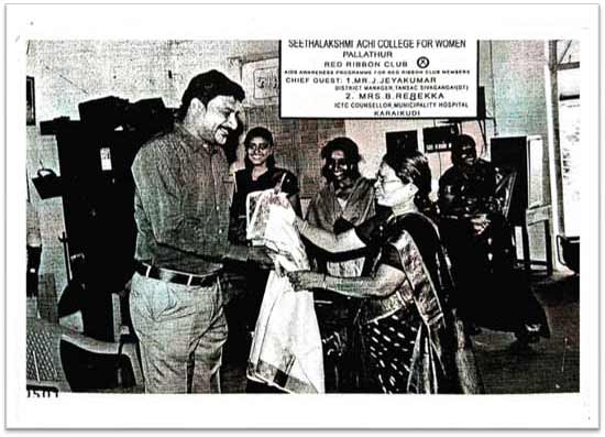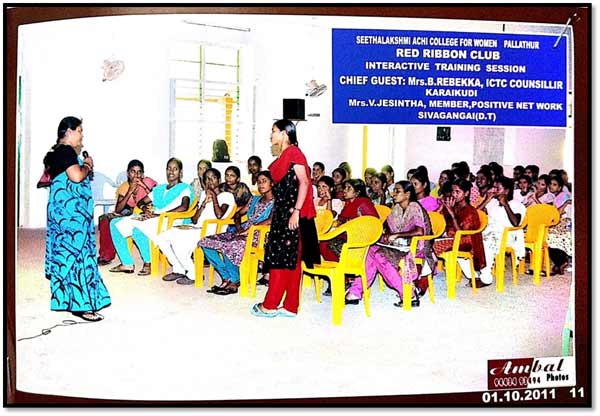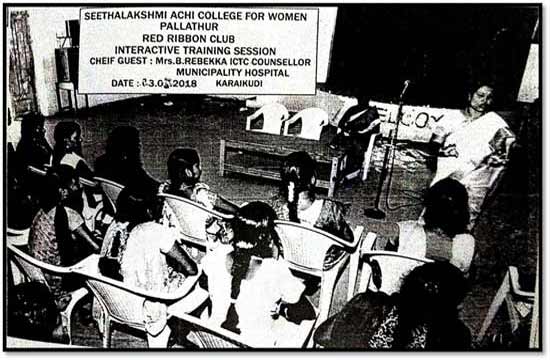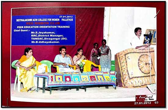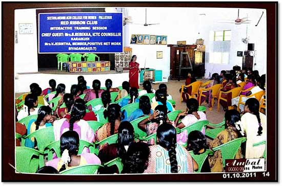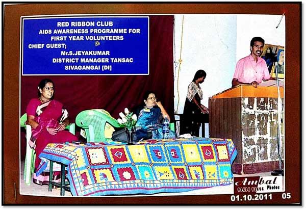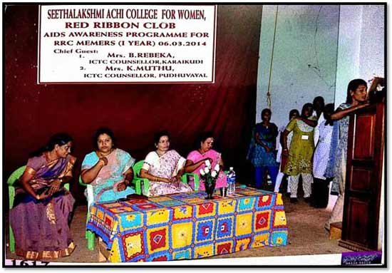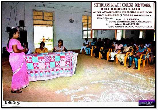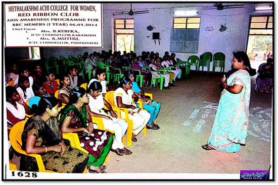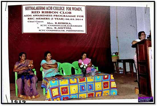 Dr. S.Padmadevi on 6-3-2014 Dr. S.Ramuthai, Principal of our college delivered the Presidential Address, Mrs. B.Rebekka, ICTC Counsellor, Municipality Hospital, Karaikudi, addressed the RRC members of our college. She explained about the roots of HIV and its impact on society. She educated the members to act as peer educators and to do service to our students and also motivated them to do selfless service to HIV affected persons and to the society. The students were very much impressed and enthusiastically interacted with the chief guest.