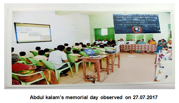 3rd memorial day was observed on 27th July 2018 to mark the respect and pay homage to the great personality of our Indian history Dr. A.P.J.ABDUL KALAM. Students and staff members planted tree saplings in our college campus and near by school, Seethaiachi school and solaiandavar school.