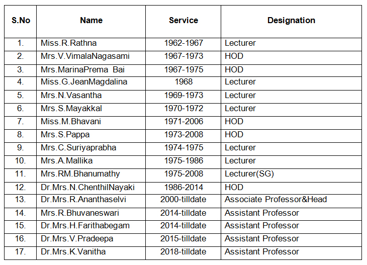 The faculty members Mrs.A.MarinaPrema Bai, Miss G.JeanMagdalina and MrsN.Vasantha extended ,dedicated and untiring service to the college and department.Later the role of Mrs.Mayakkal and MrsC.Suriyaprabha is note worthy in the annual of the history of the Department.