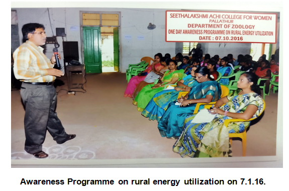 One day awareness programme on rural energy utilization on 7.1.16. at our college. Our department jointly organized with centre of excellence in Dry farming, Dryland Agricultural Research Station,Chettinad, Sivagangai and TN Agricultural University, Coimbatore. The resource Dr.Pugalendhi was the chief guest, all science departments Botany, Zoology and Chemistry were much benefitted.