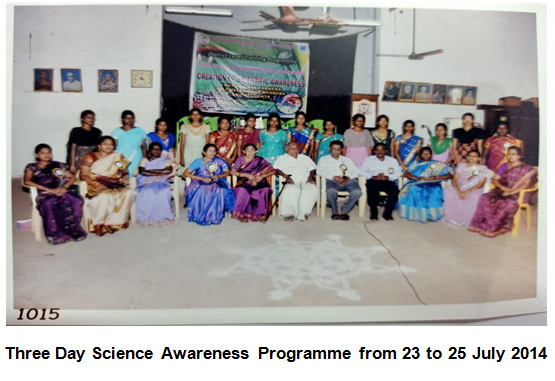 Three day programme on creation of scientific awareness among rural farmers, self help group members and students was conducted from 23rd to 25th July 2014 sponsored by Tamilnadu State Council for science and Technology , Government of TamilNadu.